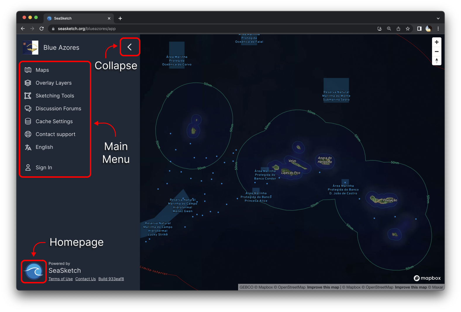 The arrow at the top right of the menu will collapse the menu panel for a better view of the map. Clicking the SeaSketch icon in the bottom left will take you to the main SeaSketch homepage.